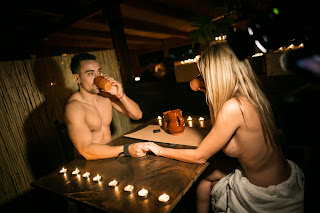 | Nothing like an intimate, nude dinner for two under the glare of a photographer's light. |