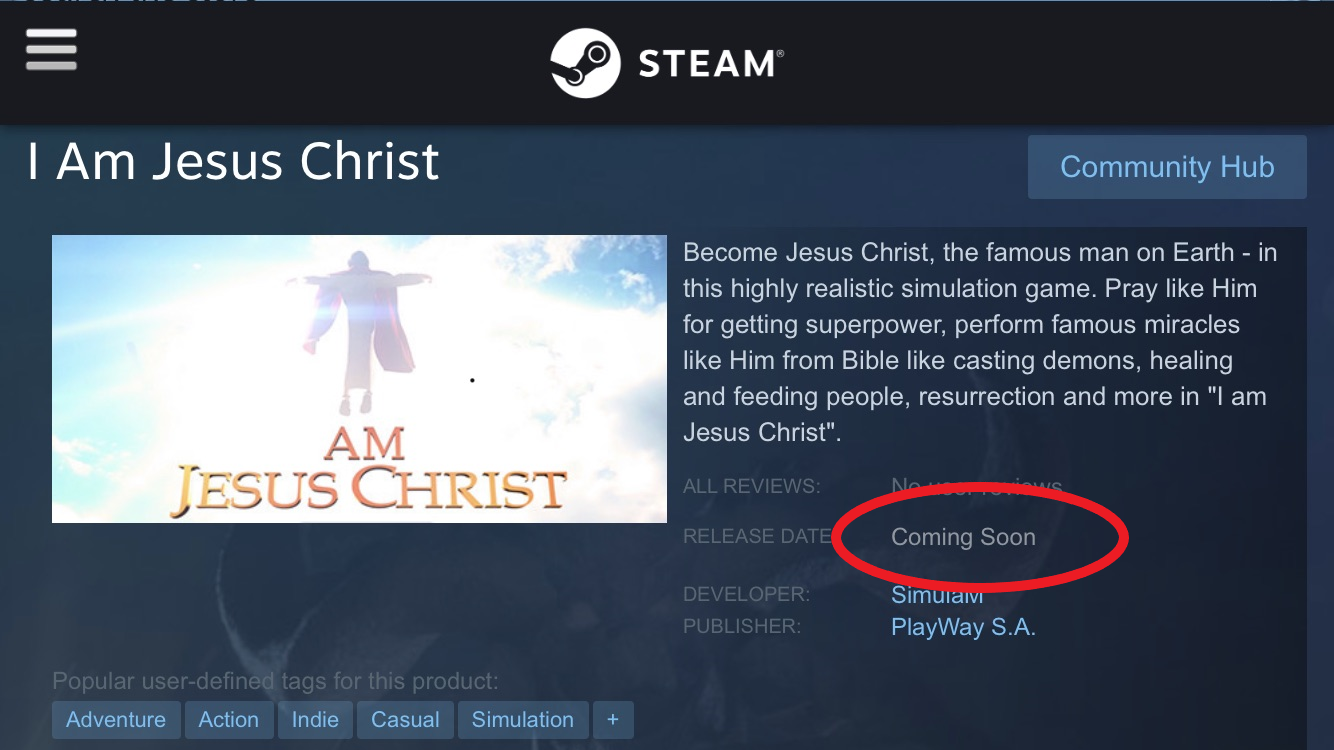 Again, I realize that I'm making a lot of assumptions about a game that isn't even out yet and may, for all I know, be an elaborate joke. But if it's not, I think the most important question is who is this even for? It seems like a lot of work for a gag, and if it's honestly a Jesus simulator made for believers, isn't it just, you know, tasteless? I guess we'll just have to wait and find out. How long? Who can say?